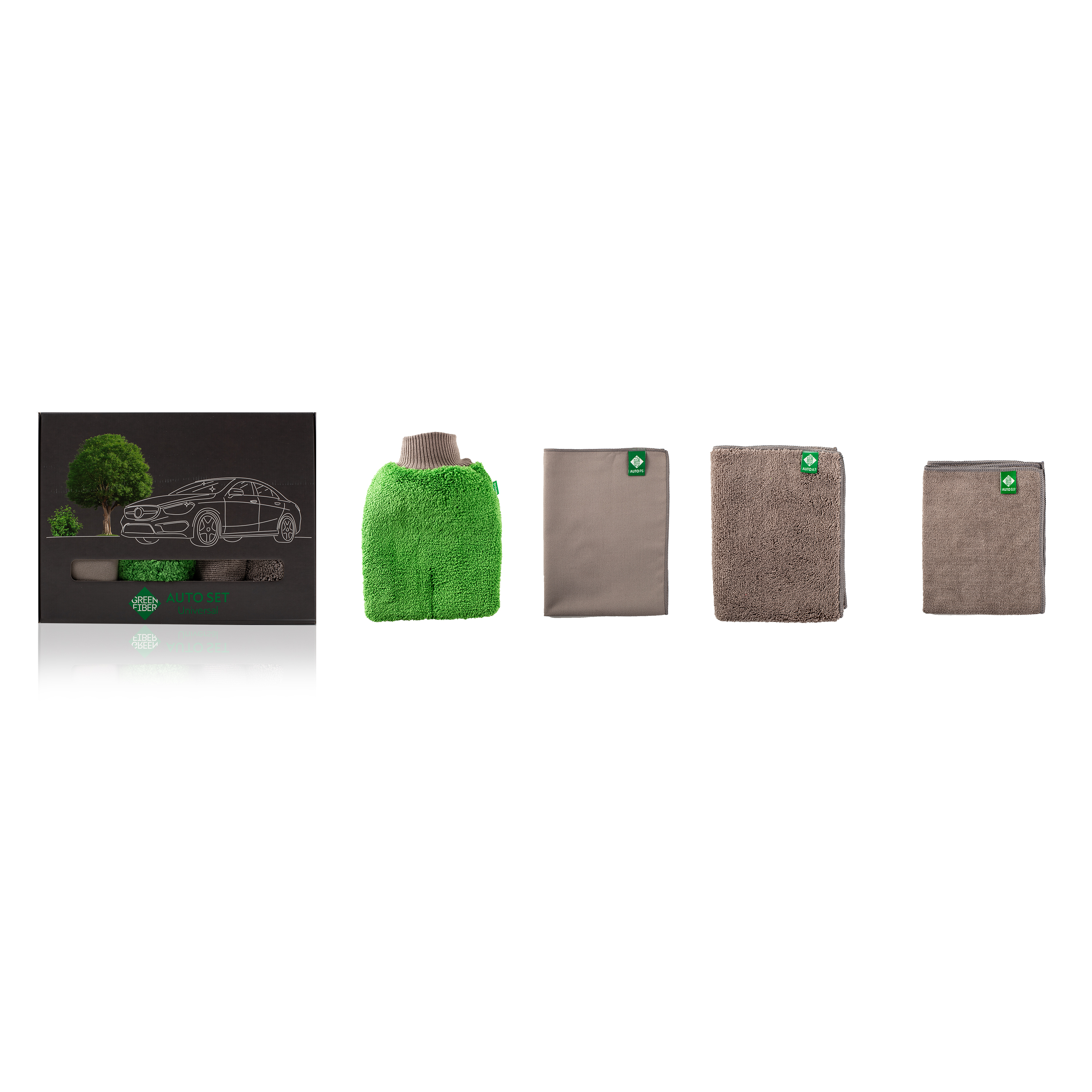 В набор входят: AUTO А6, Unimitt. Варежка универсальная, 26 x 17 см Варежка за счет особого кроя позволяет провести быструю и качественную уборку кузова автомобиля. Жесткой стороной варежка удаляет дорожную грязь и следы насекомых, мягкой – пыль. Отлично впитывает влагу, придает вытираемым поверхностям безупречный вид. Подходит для влажной и сухой уборки. AUTO A7, Unifiber. Файбер универсальный, 40 x 30 см За счет удлиненного ворса интенсивно впитывает влагу, пыль и грязь. Не оставляет ворсинок и разводов. Подходит для влажной и сухой уборки. AUTO S17, Cleaning fiber. Файбер для уборки, 40 x 30 см Позволяет провести качественную уборку салона: собрать пыль и загрязнения с приборных панелей, во влажном виде – очистить кожаные поверхности. Безупречно справляется с протиркой стёкол и зеркал. Подходит для влажной и сухой уборки. AUTO P5, Polish fiber. Файбер полирующий, 40 x 30 см Отлично очищает и полирует глянцевые, хромированные и металлические поверхности. Идеален для ухода за деликатными поверхностями, которые нельзя увлажнять. Подходит для сухой уборки.