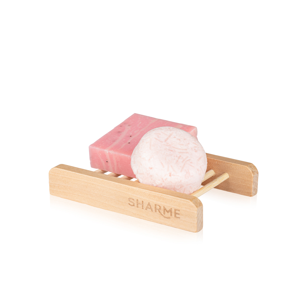 Стильная подставка из натурального бамбука позволяет удобно и эстетично хранить твердые шампуни и кондиционеры Sharme Hair. Покрыта водоотталкивающим лаком и быстро сохнет.
