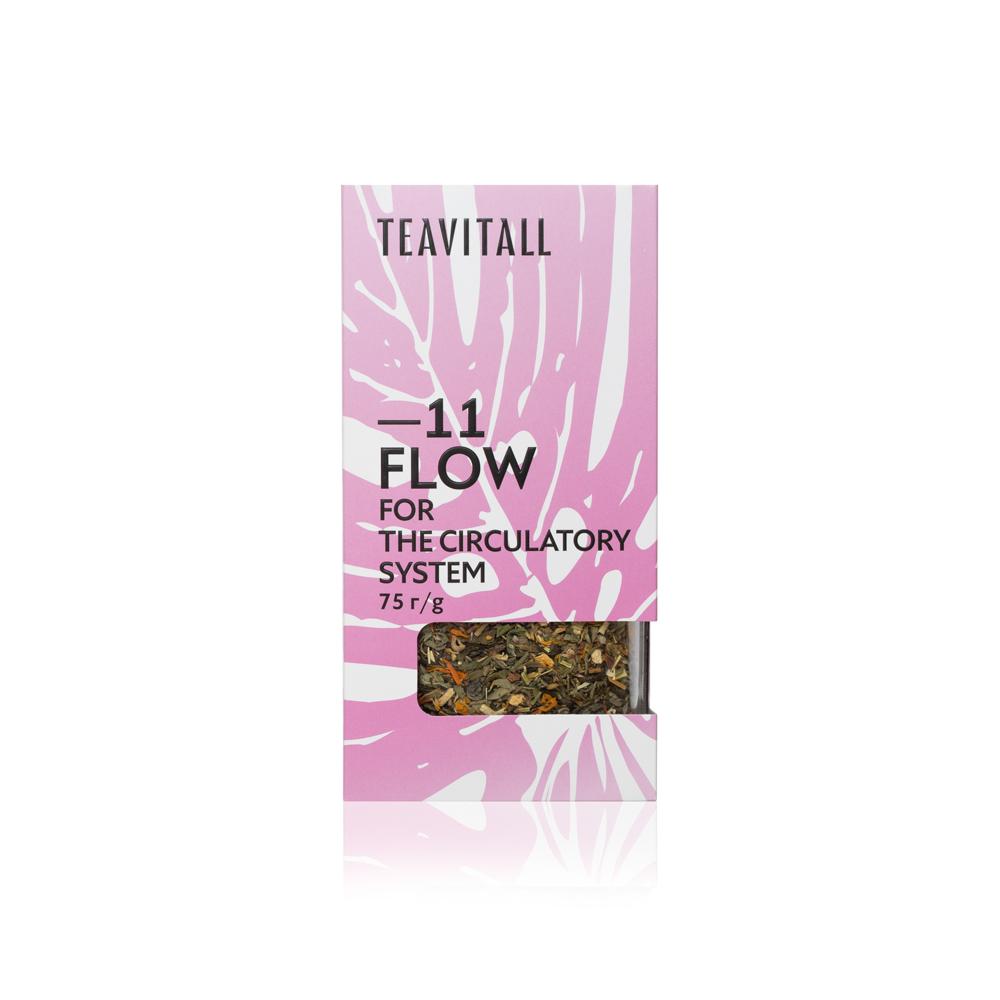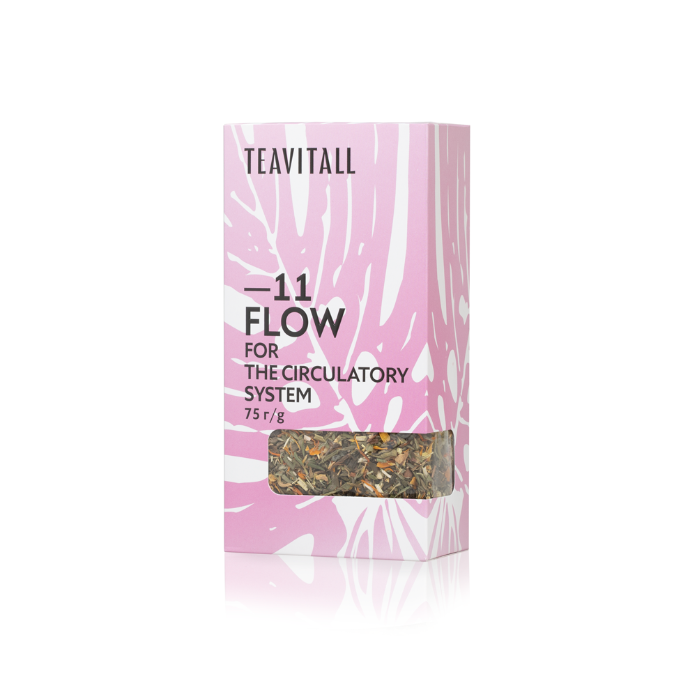 Зеленый чай (лист), курильский чай (лист), корица (кора), донник (лист), календула (цветки), имбирь (корень). Компоненты чайного напитка Flow способствуют, снижению риска образования тромбов, профилактике болезней сердца и сосудов. Растительные компоненты помогают в укреплении кровеносных сосудов. Зелёный чай антиоксидант, улучшает снабжение сосудов кислородом. Курильский чай укрепляют кровеносную систему. Корица положительно влияет на сердечно-сосудистую систему. Имбирь нормализует функции сердечно-сосудистой системы, успокаивает нервную систему. Календула нормализует кровообращение и укрепляет сердечную мышцу. Донник укрепляет стенки сосудов, улучшает микроциркуляцию и венозный кровоток. Донник придает чаю приятный травяной вкус, а имбирь и корица — пряный восточный аромат.