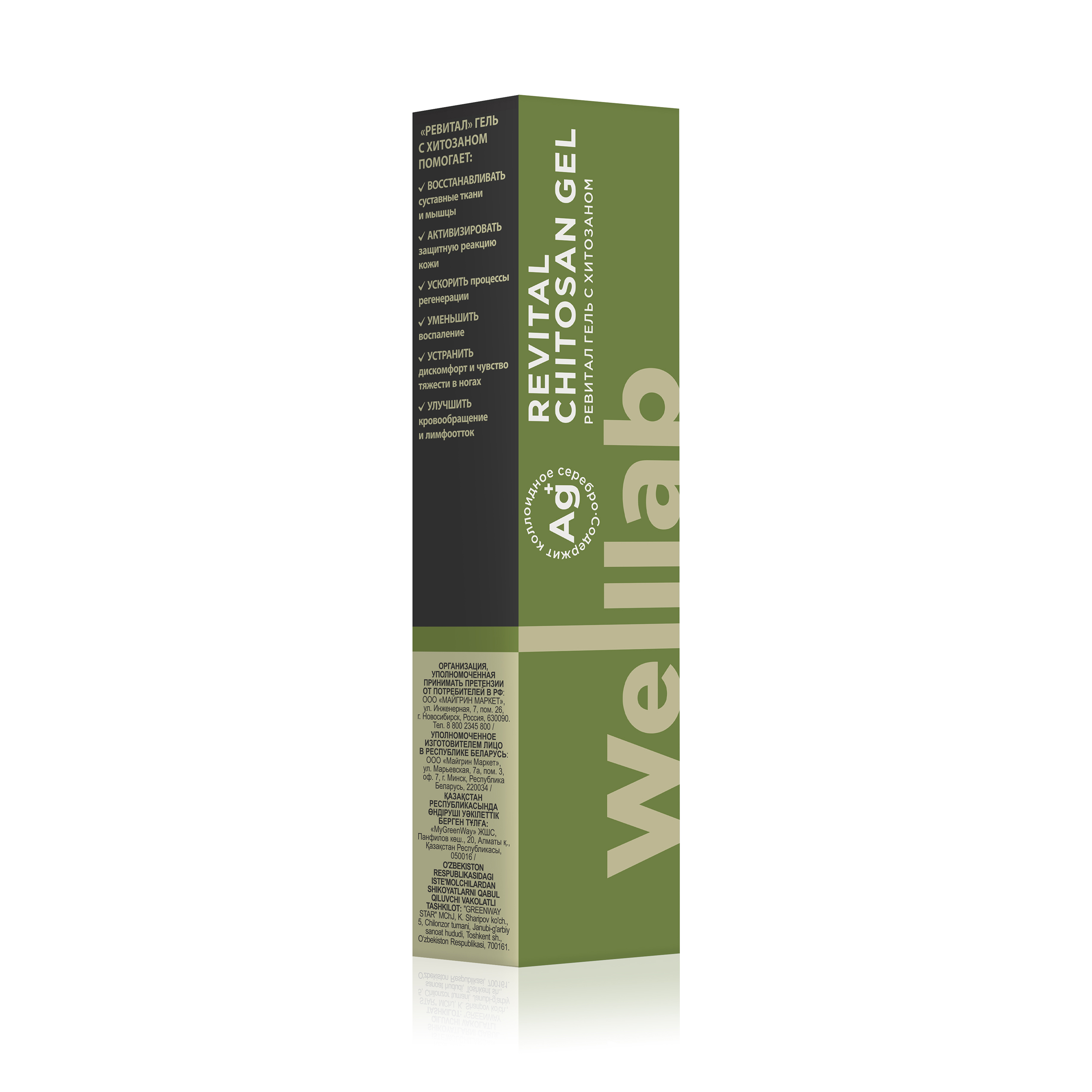 Aqua, Carboxymethyl Chitosan, Benzyl Alcohol, Glyceryl Laurate, Polyacrylic Acid, Glycerin, Comarum Palustre Root Extract, Potassium Hydroxide, Centella Asiatica Extract, Salix Alba Bark Extract, Colloidal Silver. В составе геля улучшенная форма хитозана (карбоксиметилхитозан) , которая лучше проникает в кожу и не образует пленку. Способствует уменьшению спазмов и боли в мышцах. Улучшает рассасывание гематом. Поддерживает тонус вен. Смягчающе действует на раздраженные участки кожи. Экстракт сабельника болотного улучшает микроциркуляцию в тканях, способствует ее восстановлению, уменьшая неприятные ощущения. Уменьшает отечность воспаленных тканей и облегчает болевые ощущения. Экстракт центеллы азиатской усиливает отток по венозной и лимфатической системам. Стимулирует обновление клеток эпидермиса. Экстракт коры белой ивы — природный антибиотик, помогает снять мышечную усталость, оказывает выраженный обезболивающий и противовоспалительный эффекты. Коллоидное серебро создает антимикробный барьер, ускоряет заживление кожи.